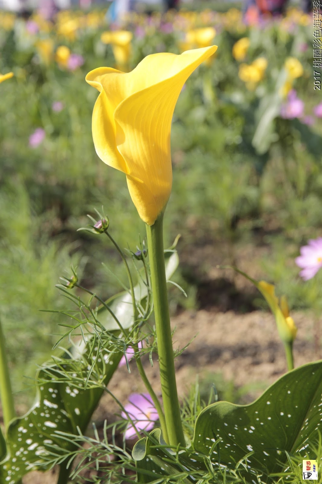 以三角形的山形架構,搭配彩色海芋柔美的線條;以綠彩背景襯托出黃色、紫紅色的彩色海芋;沉穩中帶來春天的氣息,彩色海芋以亮麗顏色吸引著遊人來一段與花朵的海誓山盟~